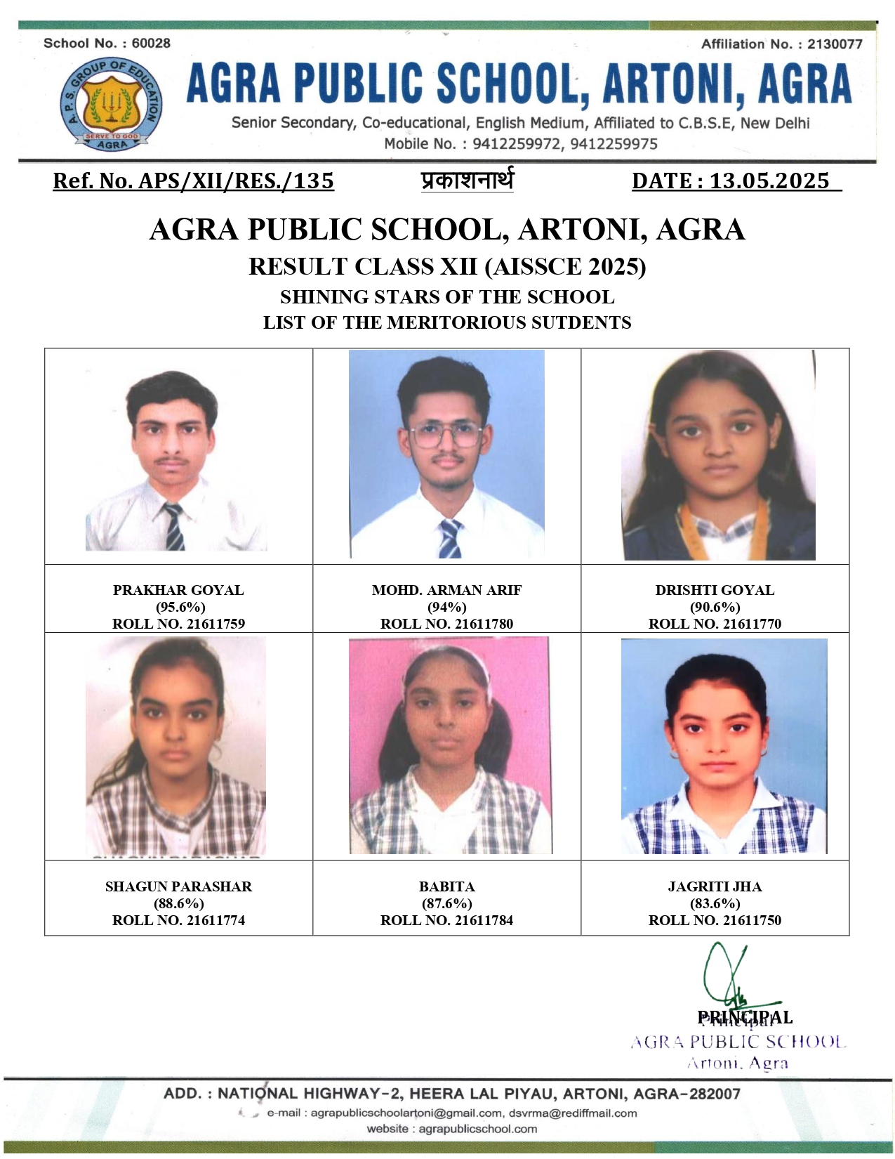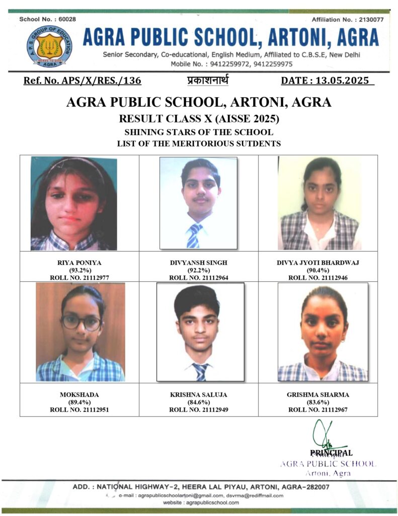 आगरालीक्स…आगरा पब्लिक स्कूल अरतौनी के टॉपर. प्रखर गोयल ने 12वीं 95.6 प्रतिशत तो रिया पोनिया ने 10वीं में 93.2 प्रतिशत हासिल कर किया टॉप…जानें स्कूल के अन्य टॉपर्स