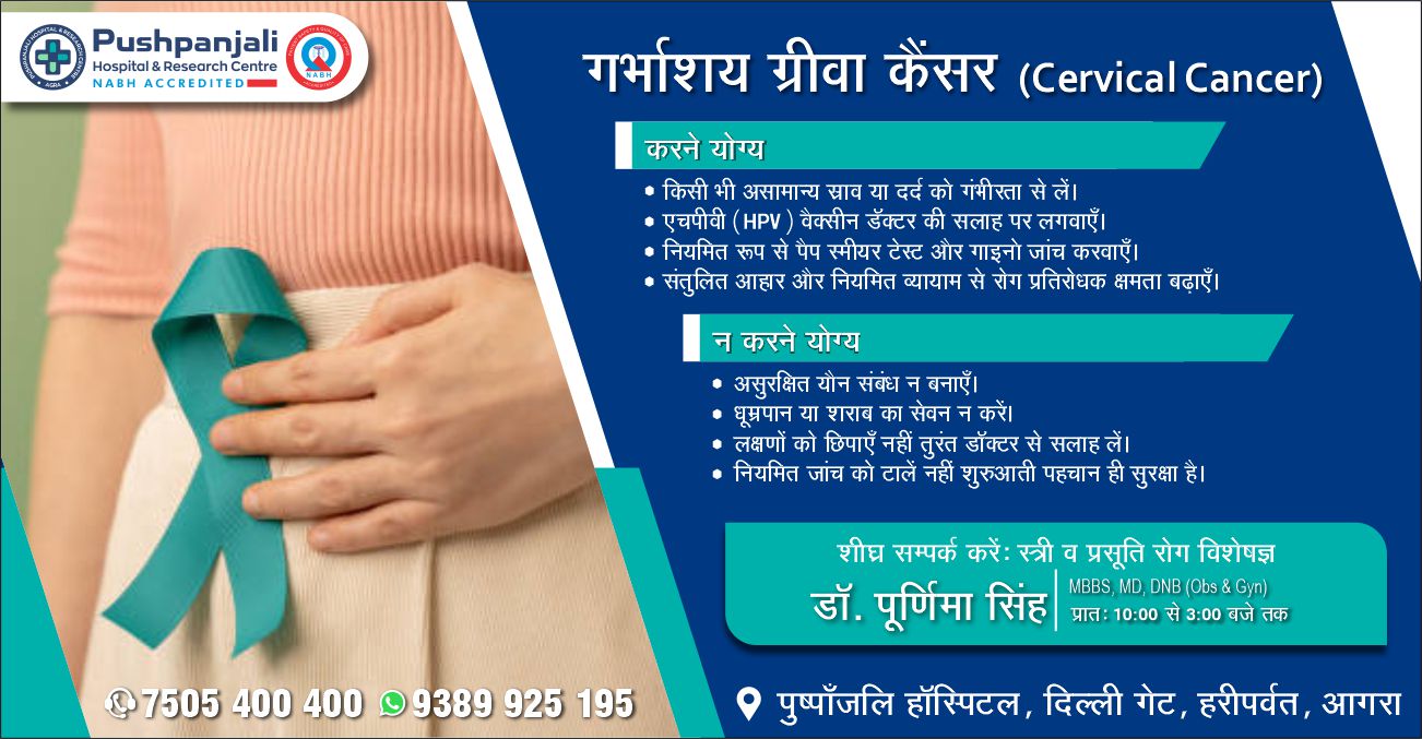 गर्भाशय ग्रीवा कैंसर— कोशिकाओं में होने वाला कैंसर है। यह मुख्य रूप से पैपिलोमावायरस (एच.पी.वी.) के संक्रमण के कारण होता है, जो यौन संपर्क से फैलता है। शुरुआती लक्षणों में योनि से असामान्य रक्तस्राव, समभोग के बाद रक्तस्राव या पेट दर्द शामिल हो सकते हैं। इसके लिए आगरा के पुष्पांजलि हॉस्पिटल एंड रिसर्च सेंटर में स्त्री एवं प्रसूति रोग विशेषज्ञ डॉ. पूर्णिमा सिंह से सुबह 10 बजे से दोपहर 3 बजे तक परामर्श ले सकते हैं.
