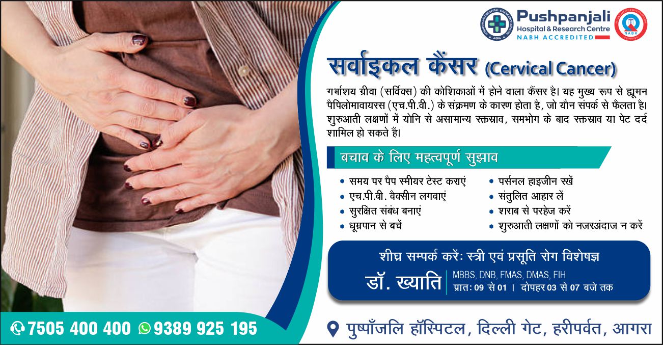 आगरालीक्स…सर्वाइकल कैंसर, गर्भाशय ग्रीवा की कोशिकाओं में होने वाला कैंसर, जो यौन संपर्क से होता है. पुष्पांजलि हॉस्पिटल मेें डॉ. ख्याति से लें परामर्श. संपर्क करें 7505400400, 9389925195