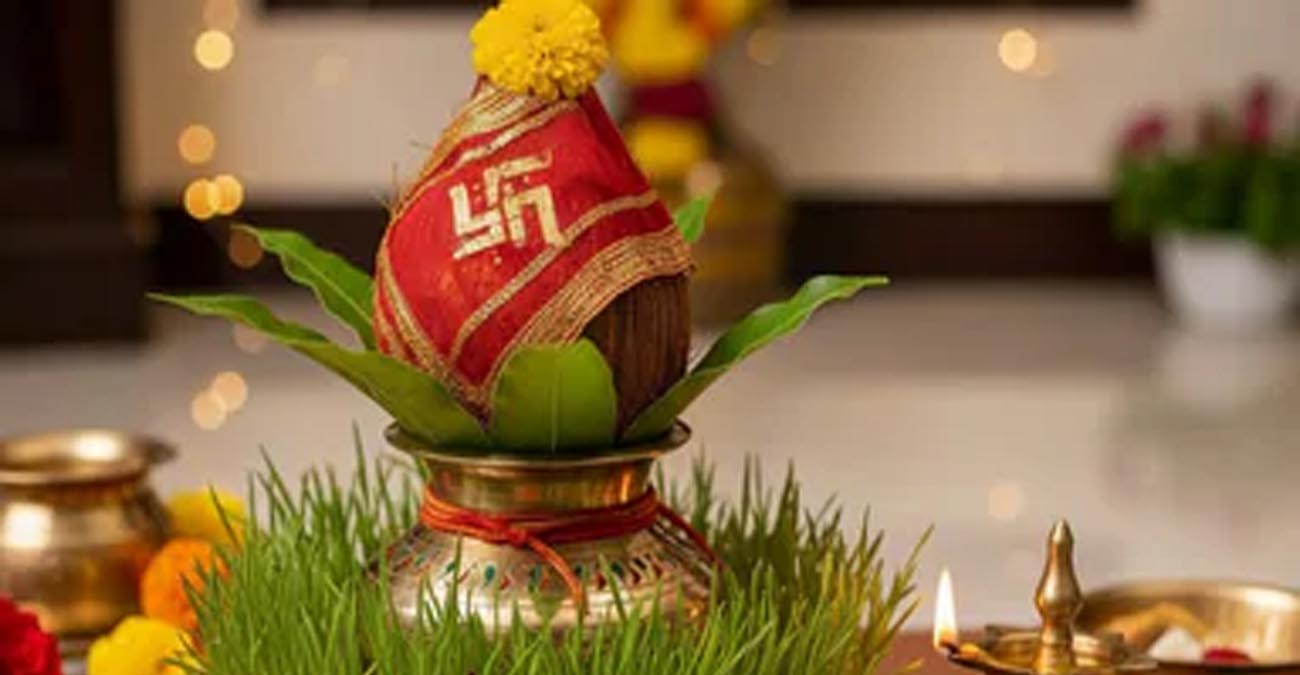 कलश तैयार करें। कलश पर स्वस्तिक बनायें। कलश के गले में मौली बांधें। अब कलश को थोड़े गंगा जल और शुद्ध जल से पूरा भर दें। कलश में साबुत सुपारी , फूल और दूर्वा डालें। कलश में इत्र , पंचरत्न तथा सिक्का डालें। अब कलश में पांचों प्रकार के पत्ते डालें। कुछ पत्ते थोड़े बाहर दिखाई दें इस प्रकार लगाएँ। चारों तरफ पत्ते लगाकर ढ़क्कन लगा दें। इस ढ़क्कन में अक्षत यानि साबुत चावल भर दें।