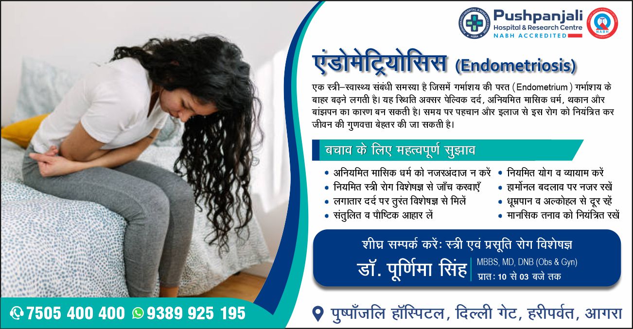 एक स्त्री-स्वास्थ्य संबंधी समस्या है जिसमें गर्भाशय की परत (Endometrium) गर्भाशय के बाहर बढ़ने लगती है। यह स्थिति अक्सर पेल्विक दर्द, अनियमित मासिक धर्म, थकान और बांझपन का कारण बन सकती है। समय पर पहचान और इलाज से इस रोग को नियंत्रित कर जीवन की गुणवत्ता बेहतर की जा सकती है। इसके लिए आगरा के पुष्पांजलि हॉस्पिटल एंड रिसर्च सेंटर में स्त्री एवं प्रसूति रोग विशेषज्ञ डॉ. पूर्णिमा सिंह से सुबह 10 बजे से 3 बजे तक परामर्श ले सकते हैं.