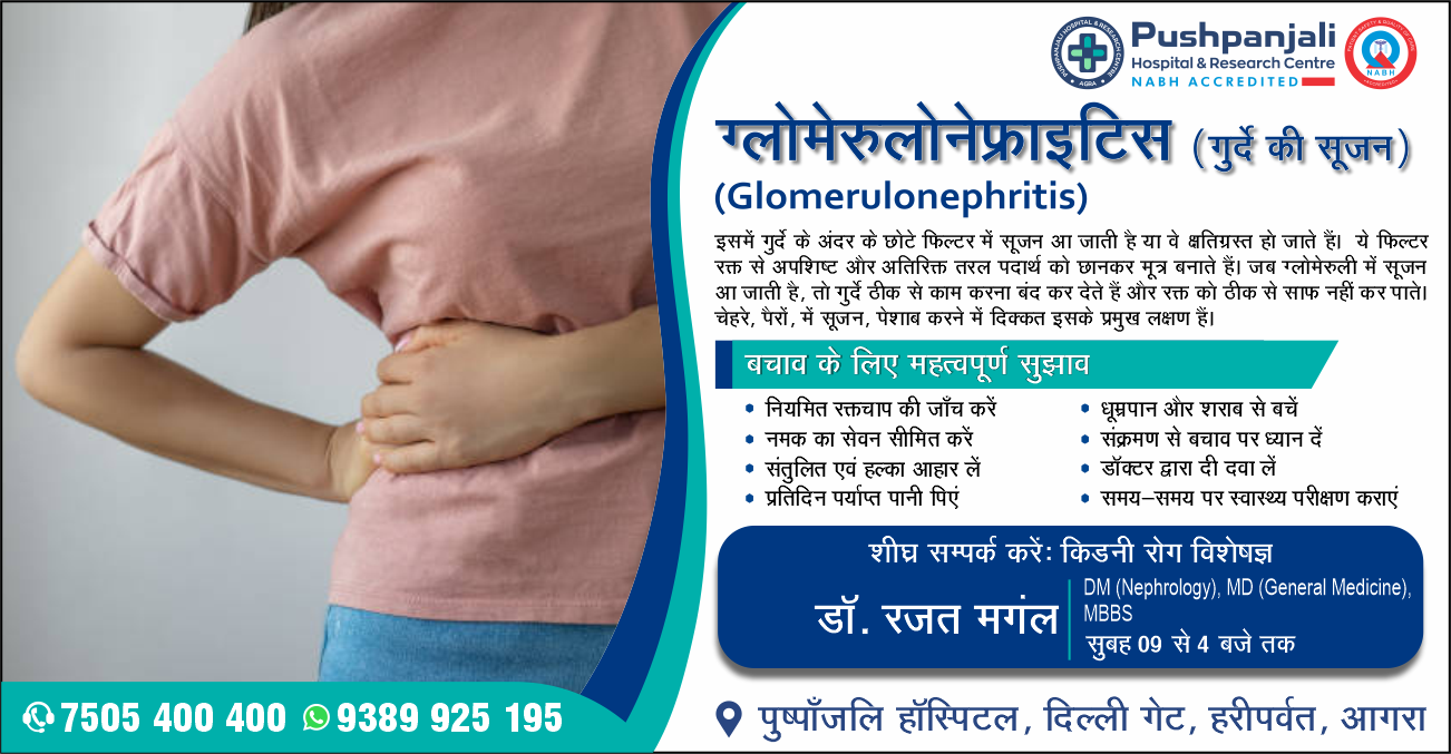 आगरालीक्स…हल्के में न लें गुर्दे की सूजन को, सूजन के कारण ठीक से रक्त को साफ नहीं कर पाते गुर्दे. पुष्पांजलि हॉस्पिटल में किडनी रोग विशेषज्ञ डॉ. रजत मगंल से लें परामर्श. संपर्क करें — 7505400400 9389925195