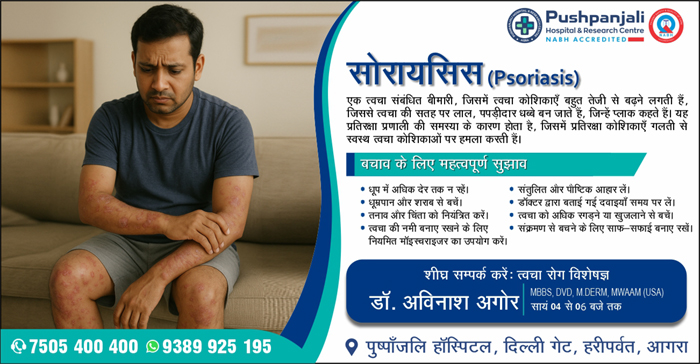 आगरा के पुष्पांजलि हॉस्पिटल एंड रिसर्च सेंटर में सोरायसिस का इलाज उपलब्ध है. सेरायसिस एक त्वचा संबंधित बीमारी है जिसमें त्वचा कोशिकाएं बहुत तेजी से बढ़ने लगती हैं, जिससे त्वचा की सतह पर लाल, पपड़ीदार धब्बे बन जाते हैं, जिन्हें प्लॉक कहते हैं. यह प्रतिरक्षा प्रणाली की समस्या के कारण होता है, जिसमें प्रतिरक्षा कोशिकाएं गलती से स्वस्थ त्वचा कोशिकाओं पर हमला करती है. इसके लिए अस्पताल में त्वचा रोग विशेषज्ञ डॉ. अविनाश अगोर से शाम 4 बजे से 6 बजे तक परामर्श ले सकते हैं.