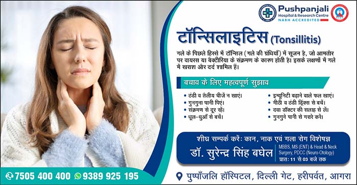 आगरालीक्स…क्या आप भी है टॉन्सिल से परेशान. गले में सूजन, खराश या दर्द है तो पुष्पांजलि हॉस्पिटल में डॉ. सुरेंद्र सिंह बघेल से लें परामर्श. संपर्क करें 7505400400, 9389925195