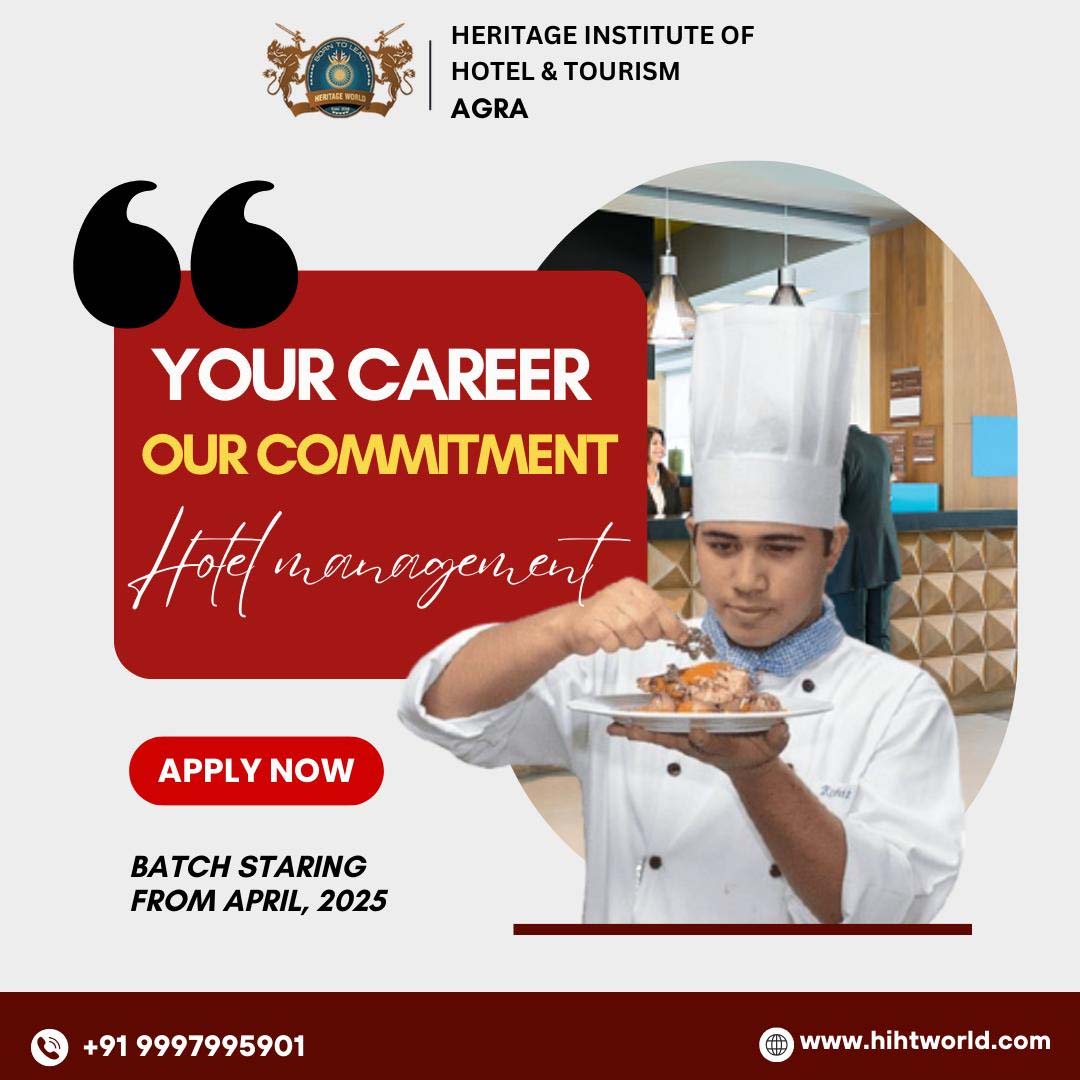 हेरिटेज इंस्टीट्यूट ऑफ होटल एंड टूरिज्म आगरा आतिथ्य शिक्षा में उत्कृष्टता के लिए प्रसिद्ध एक अग्रणी संस्थान में वर्ष 2025-26 शैक्षणिक सत्र के लिए होटल प्रबंधन में डिप्लोमा के लिए प्रवेश प्रक्रिया शुरू हो गयी है। यह व्यापक कार्यक्रम छात्रों को गतिशील और लगातार बढ़ते आतिथ्य उद्योग में उत्कृष्टता प्राप्त करने के लिए आवश्यक कौशल और ज्ञान से लैस करने के लिए डिजाइन किया गया है। पाठ्यक्रम में आवश्यक सॉफ्ट कौशल और उद्योग अंतर्दृष्टि के साथ-साथ फ्रंट ऑफिस, फूड एण्ड बेवरेज सर्विस, बारटेंडिग, फूड प्रोडक्शन और बेकरी और कन्फेक्शनरी में डिपलोमा कराया जा रहा हैं।