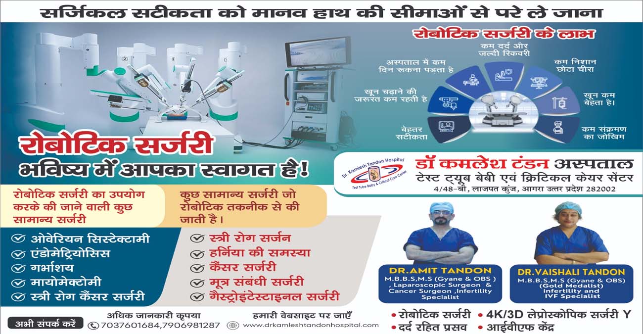 आगरालीक्स...आगरा का पहला स्त्री रोग एडवांस रोबोटिक सेंटर, अब रोबोटिक से बच्चेदानी और रसौली के दूरबीन विधि से जटिल आपरेशन हुए आसान। डॉ. कमलेश टंडन हॉस्पिटल और टेस्ट ट्यूब बेबी एवं क्रिटिकल केयर सेंटर। संपर्क करें 7037601684, 05622525369, 2521569, 7078432277