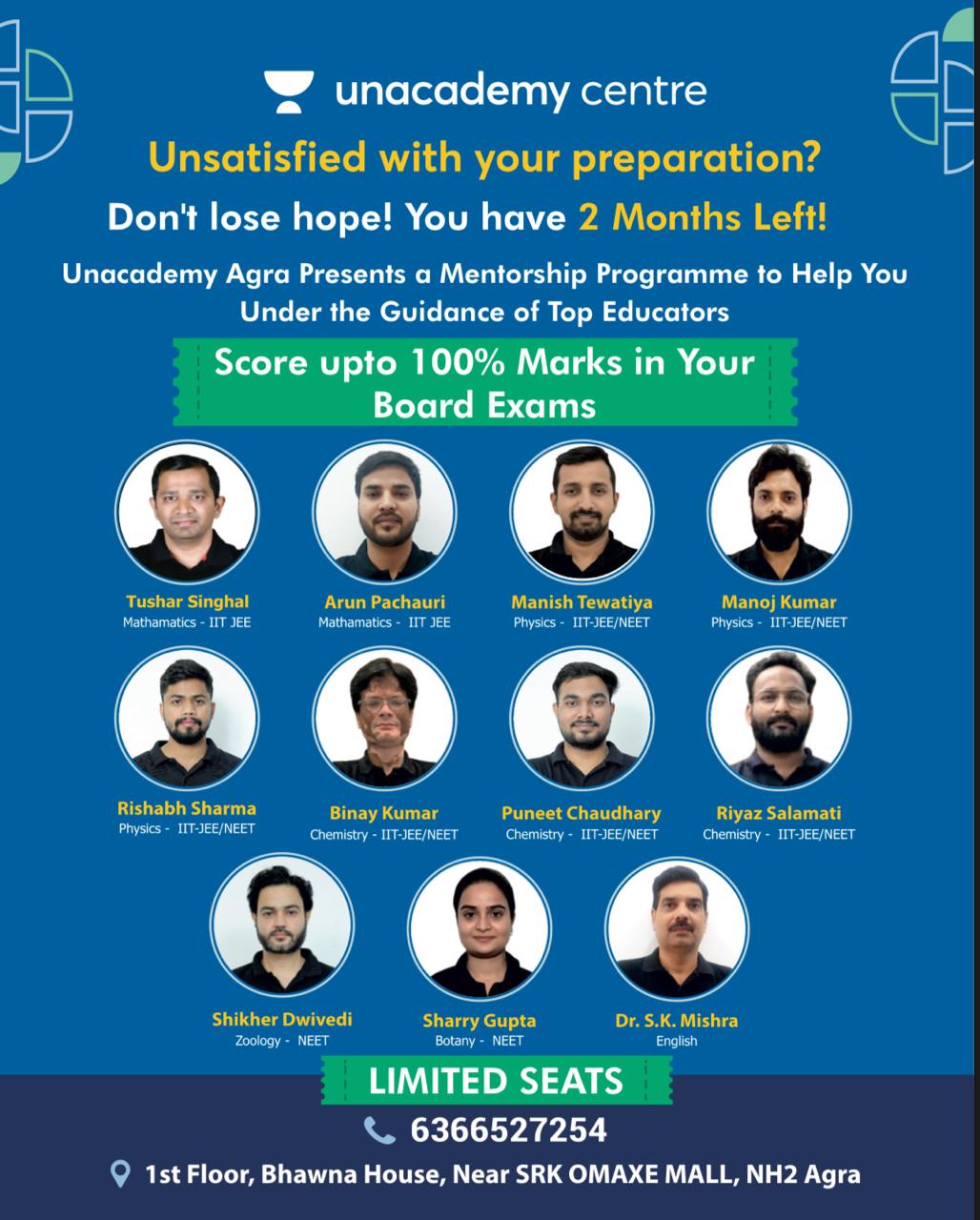आईसीएसई, सीबीएसई, यूपी बोर्ड एग्जाम में अभी भी दो माह का समय शेष है. अगर आपको लगता है कि आपकी तैयारी अधूरी है और चिंता में हैं कि कैसे पूरी होगी तो इसके लिए आगरा में बेस्ट एजुकेशन प्वाइंट अनएकेडमी आपके लिए पूरी तरह से तैयार है. आगरा का अनएकेडमी सेंटर को ज्वाइन करके न सिर्फ आप अपनी तैयारियों को पूरा कर सकते हैं बल्कि अच्छे अंक भी प्रापत कर सकते हैं. इसके लिएअ अनएकेडमी आगरा मेंटरशिप प्रोग्राम लेकर आया है जो कि टॉप एजुकेटर्स की गाइडेंस में आपकी मदद कर सकता है.
