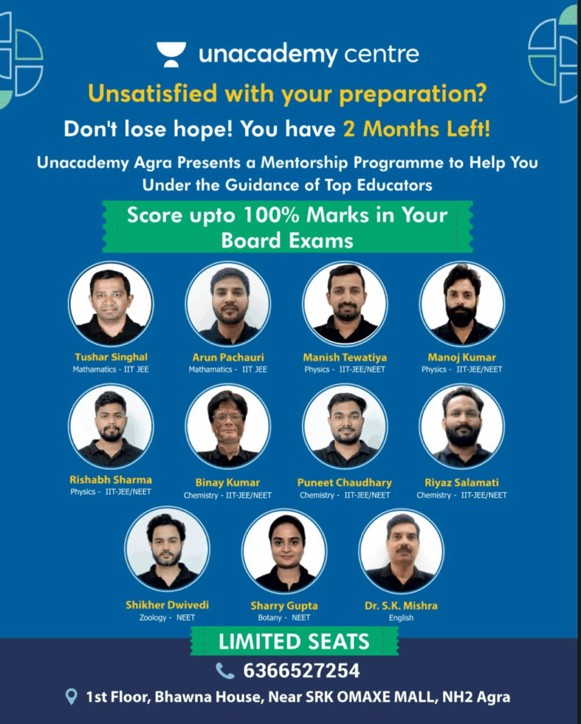 आगरालीक्स…बोर्ड एग्जाम की तैयारी के लिए अभी भी दो महीने का समय. देर न कीजिए और आगरा में अनएकेडमी ज्वाइन कीजिए. मेंटरशिप प्रोग्राम में टॉप एजुकेटर्स की गाइडेंस में पूरी करें तैयारी. लिमिटेड सीट्स, संपर्क करें 6366527254