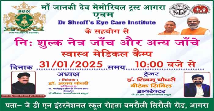 जानकी देवी मेमोरियल ट्रस्ट की ओर से निःशुल्क स्वास्थ्य शिविर के तहत निशुल्क नेत्र चेकअप शिविर का आयोजन 31 जनवरी 2025 को आगरा के रोहता बाग स्थित जेडीएन इंटरनेशनल स्कूल में लगने जा रहा है. शिविर में आंखों का चेकअप किया जाएगा और अन्य जरूरी जांचें भी फ्री में कराई जाएगी.