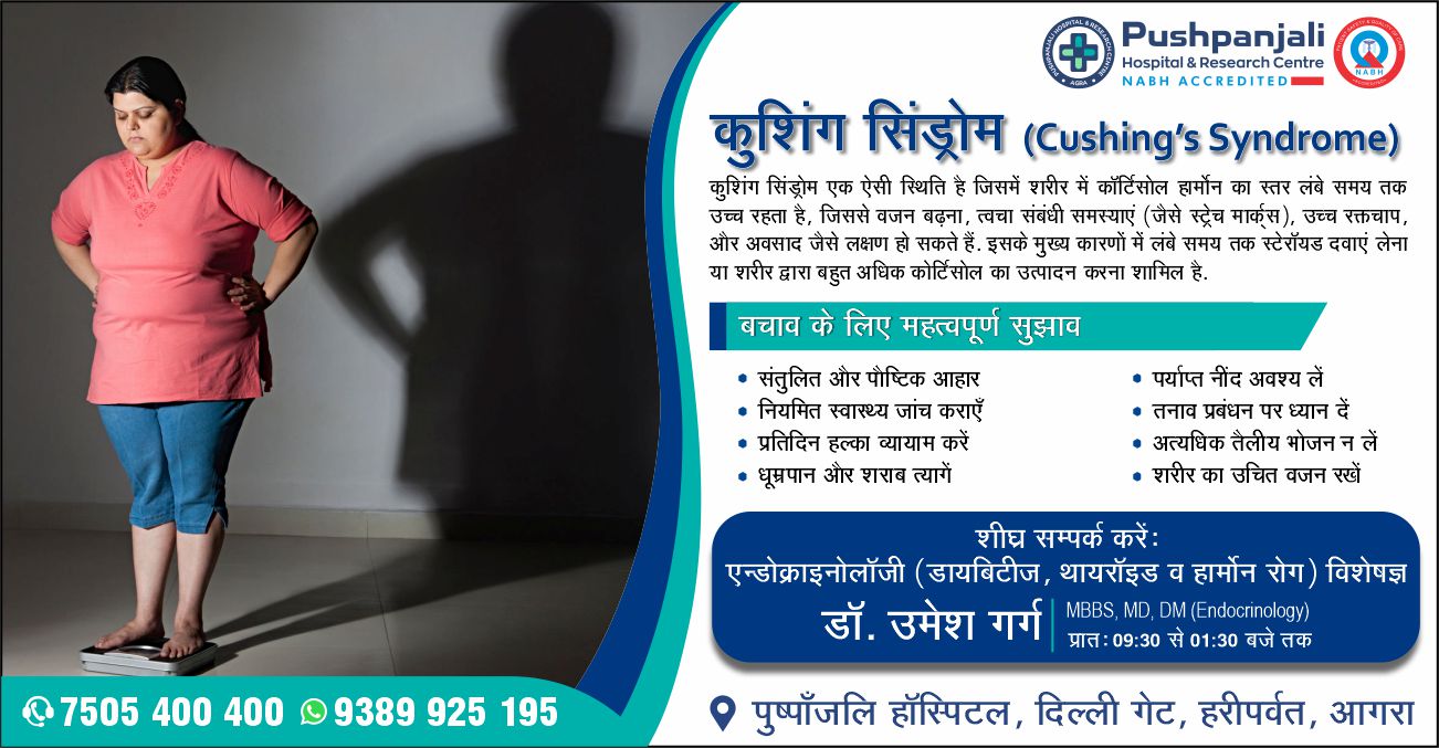 आगरालीक्स…वजन बढ़ना, स्ट्रेच मार्क्स, उच्च रक्तचाप और अवसाद जैसे लक्षणों की निशानी है कुशिंग्स सिंड्रोम. पुष्पांजलि हॉस्पिटल में एन्डोक्राइनोलॉजी विशेषज्ञ डॉ. उमेश गर्ग से लें परामर्श