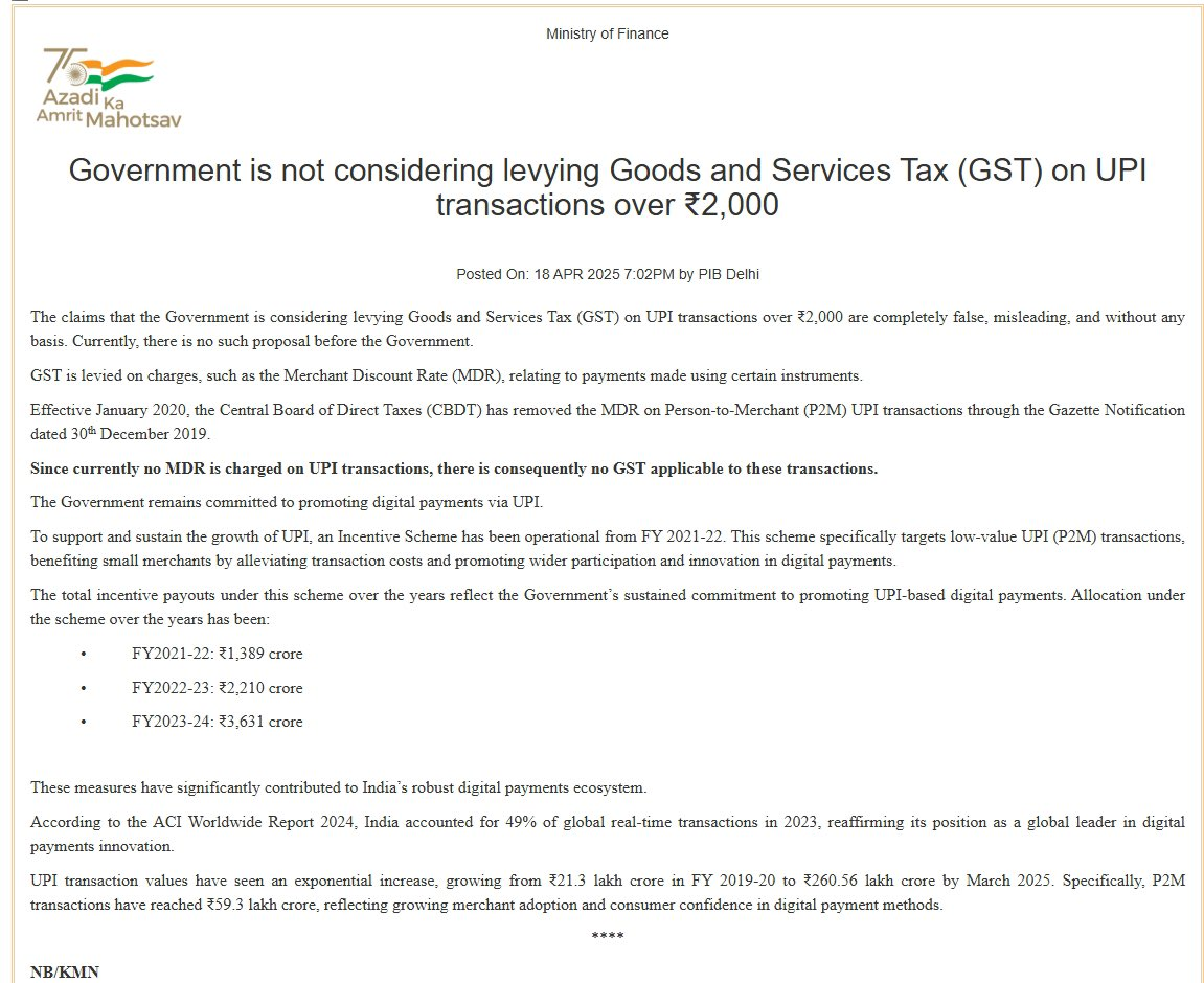 सोशल मीडिया और कुछ प्लेटफाम्र्स पर यह दावा किया जा रहा है कि केंद्र सरकार अब 2000 से अधिक की यूपीआई ट्रांजेक्शन पर सरकार जीएसटी लगाने पर विचार कर रही है. लेकिन अब इस दावे पर सरकार ने अपना नया सर्कुलर जारी कर साफ कर दिया है. जारी किए गए नए सर्कुलर में सरकार ने इन दावों को पूरी तरह से खारिज करते हुए कहा है कि यह खबरें पूरी तरह झूठी, भ्रामक ओर आधारहीन हैं. वित्त मंत्रालय ने बताया कि सरकार के पास इस तरह का कोई प्रस्ताव नहीं है. वित्त मंत्रालय की ओर से स्पष्ट किया गया है कि जीएसटी केवल उन्हीं चार्जेस पर लगाया जाता है जो पेमेंट गेटवे या अन्य माध्यमों द्वारा लगाए जाने वाले सर्विस शुल्क से जुड़े होते हैं लेकिन जनवरी 2020 से सीबीडीटी ने पीटूएम यूपीआई ट्रांजेक्शन पर एमडीआर को हटा दिया है, जिसका अर्थ है कि यूपीआई पेमेंट पर कोई अतिरिक्त शुल्क नहीं लिया जा रहा है. इसलिए जीएसटी लगाने का सवाल ही नहीं उठता.