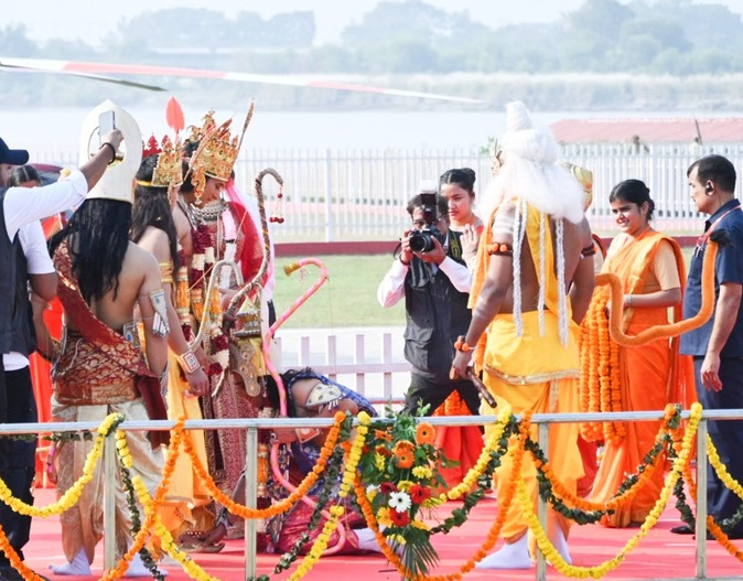 इससे पहले अयोध्या में मानो त्रेता युग जीवंत हो गया हो. पुष्पक विमान रूपी हेलीकॉप्टर से राम, लक्ष्मण, सीता और हनुमान के स्वरूप रामकथा पार्क हेलीपैड पहुंचे. यहां सीएम योगी आदित्यनाथ ने कई मंत्रियों के साथ भगवान के स्वरूपों की अगवानी की. यहां राम जानकी की वंदना के साथ भरत मिलाप भी हुआ.