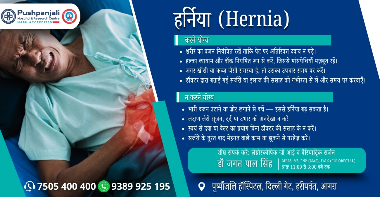 हर्निया (Hernia) एक ऐसी स्थिति है जिसमें शरीर का कोई अंग या ऊतक मांसपेशियों की दीवार में कमजोरी या छेद होने के कारण बाहर निकल आता है, अक्सर पेट, नाभि या जांघों के पास. इसके लक्षणों में सूजन या गांठ दिखना, खासकर खड़े होने पर, जो लेटने पर गायब हो जाती है, और खांसने या वजन उठाने पर दर्द बढ़ना शामिल हैं. अगर आप भी हर्निया की समस्या से परेशान है ग्रसित हैं तो बेहतर उपचार के आगरा के पुष्पांजलि हॉस्पिटल एंड रिसर्च सेंटर में लेप्रोस्कोपिक जी आई व बैरियाट्रिक सर्जन डॉ जगत पाल सिंह से प्रातः 11:00 से 3:00 बजे तक परामर्श ले सकते हैं.