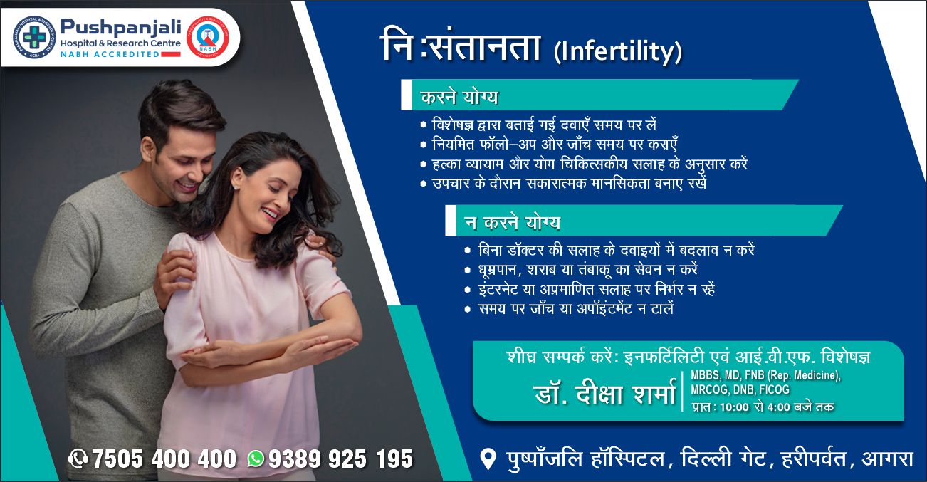 आगरालीक्स…निःसंतानता (Infertility)—आगरा के पुष्पांजलि हॉस्पिटल में इनफर्टिलिटी एवं आई.वी.एफ. विशेषज्ञ डॉ. दीक्षा शर्मा से लें परामर्श. संपर्क करें 7505400400, 9389925195