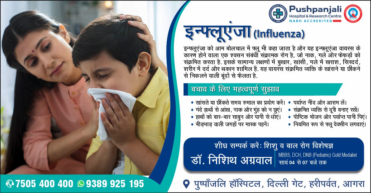 इन्फ्लूएंजा को आम बोलचाल में फ्लू भी कहा जाता है और यह इन्फ्लूएंजा वायरस के कारण होने वाला एक श्वसन संबंधी संक्रामक रोग है, जो नाक, गले और फेफड़ों को संक्रमित करता है. इसके सामान्य लक्षणों में बुखार, खांसी, गले में खराश, सिरदर्द, शरीर में दर्द और थकान शामिल हैं. यह वायरस संक्रमित व्यक्ति के खांसने या छींकने से निकलने वाली बूंदों से फैलता है. आगरा को पुष्पांजलि हॉस्पिटल एंड रिसर्च सेंटर में बाल रोग विशेषज्ञ डॉ. निशिथ अग्रवाल से सायं 04 से 07 बजे तक परामर्श ले सकते हैं.