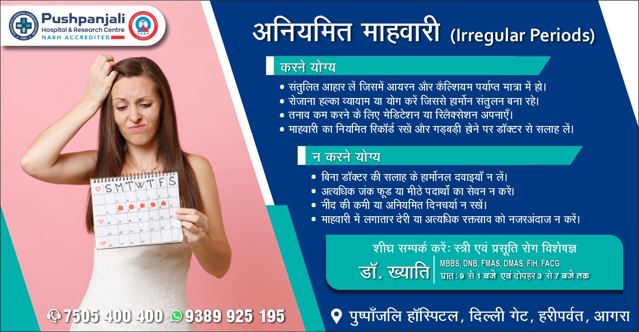 अनियमित महावारी का मतलब है कि पीरियड्स का पैटर्न अनिश्चित हो, जैसे कि 21 दिनों से कम या 35 दिनों से अधिक समय बाद आना, या रक्तस्राव बहुत हल्का या बहुत भारी होना। इसके सामान्य कारणों में यौवन, रजोनिवृत्ति, तनाव, हार्मोनल असंतुलन और कुछ दवाएं शामिल हैं। जीवनशैली में बदलाव जैसे तनाव कम करना, व्यायाम करना और स्वस्थ आहार लेना मददगार हो सकता है, लेकिन यदि यह समस्या बनी रहती है तो डॉक्टर से परामर्श करना महत्वपूर्ण है। इसके लिए आगरा में पुष्पांजलि हॉस्पिटल एंड रिसर्च सेंटर में स्त्री एवं प्रसूति रोग विशेषज्ञ डॉ. ख्याति प्रातः 9 से 1 बजे एवं दोपहर 3 से 7 बजे तक परामर्श ले सकते हैं.