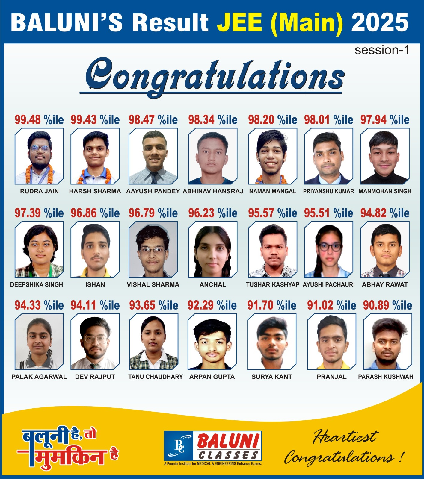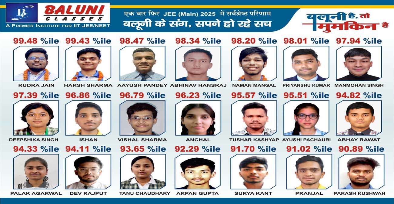 आगरालीक्स…आगरा के बलूनी क्लासेस के छात्र रुद्र जैन और आयुष पांडेय ने जेईई मेन में मारी बाजी, 99.48 और 99.43 पर्सेंटाइल प्राप्त किए। 21 स्टूडेंट्स के 90 से अधिक पर्सेंटाइल।