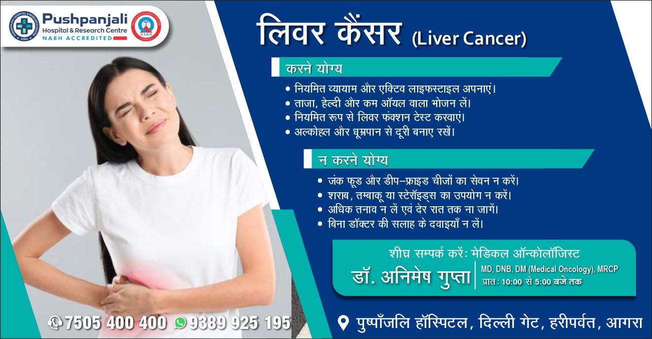 आगरालीक्स…लिवर कैंसर—पुष्पांजलि हॉस्पिटल में मेडिकल ऑन्कोलॉजिस्ट डॉ. अनिमेष गुप्ता से लें परामर्श..संपर्क करें 7505400400, 9389925195