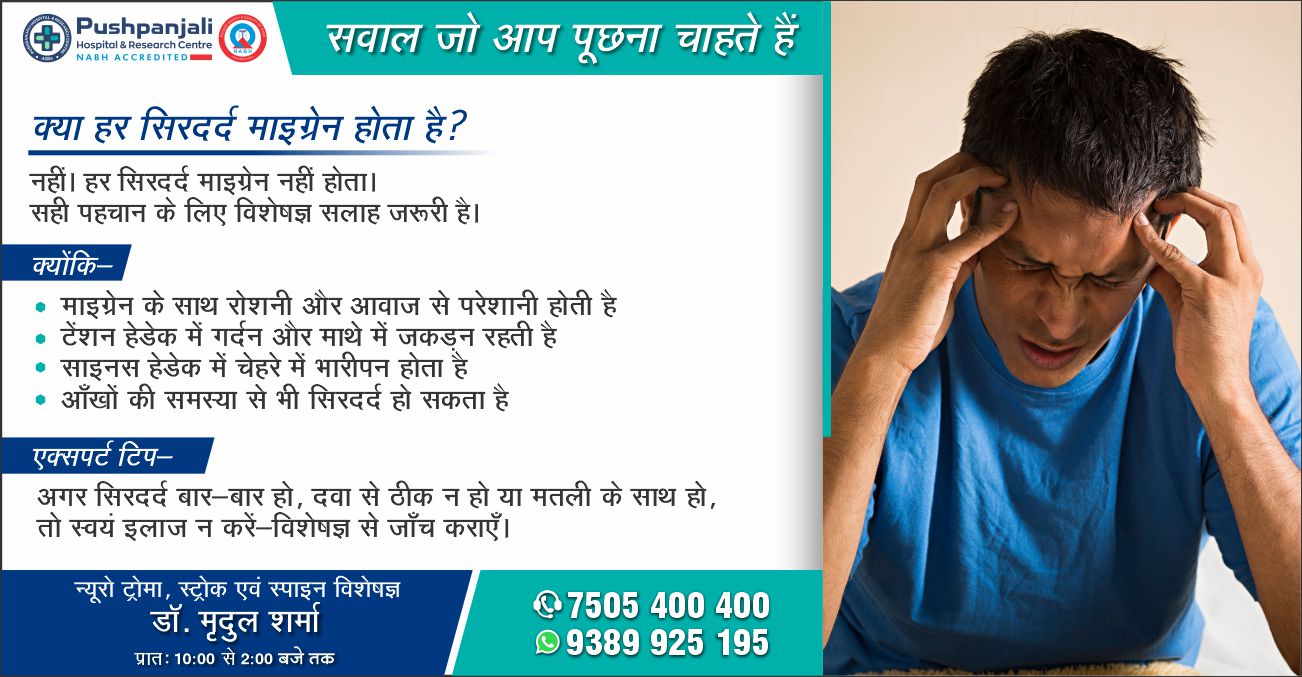 आगरालीक्स…लगातार हो रहा सिर में दर्द माइग्रेन तो नहीं. सही पहचान के लिए आगरा के पुष्पांजलि हॉस्पिटल में डॉ. मृदुल शर्मा से लें परामर्श. संपर्क करें 7505400400, 9389925195