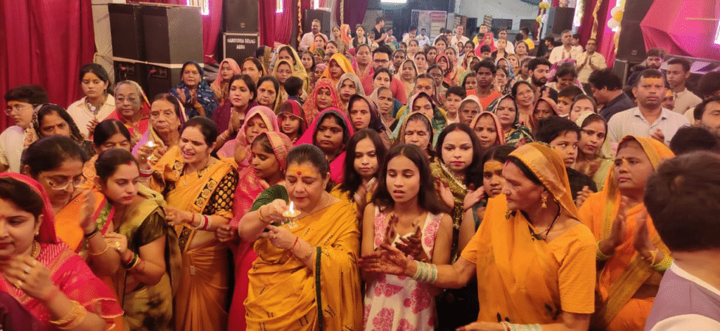 आज पण्डाल में मुख्य अतिथि के रूप में मां दुर्गा की 15 फुट की मूर्ति बनाने वाले कलकत्ता के कारीगर विकास दादा भी पहुंचे। विधि विधान के साथ उन्होंने मां दुर्गा का पूजन किया। वृंदावन से आए भूदेव कृष्ण शास्त्री व लखनऊ से आए आचार्य लघु मिश्रा द्वारा विधि विधान के साथ प्रतिजिन चार आरती सम्पन्न करायी जा रही हैं। 28 सितम्बर को डांडिया उत्सव व 29 सितम्बर को महाआरती का आयोजन होगा। 30 सितम्बर को कन्या पूजन व एक अक्टूबर को पण्डाल में आकर्षक झांकियां सजायी जाएंगी। दो अक्टूबर को भण्डारा व 3 अक्टूबर को सुंदरकाण्ड पाठ के साथ 12 दिवसीय उत्सव का समापन होगा। 4 अक्टूबर को विसर्जन किया जाएगा। इस अवसर पर मुख्य रूप से मुकेश, आकाश, मनीष, दिनेश कुशवाह, विष्णु, पार्षद विक्रांत कुशवाह, पार्षद अमित पटेल, पिंकी, रिया, सुमन, रूबी आदि उपस्थित थीं।