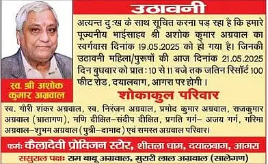 आगरालीक्स:…आगरा में आज उठावनी, आगरालीक्स पर उठावनी प्रकाशित कराने के लिए कॉल करें 999794214