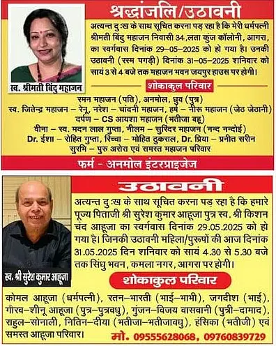 आगरालीक्स:…आगरा में आज उठावनी, आगरालीक्स पर उठावनी प्रकाशित कराने के लिए कॉल करें 999794214