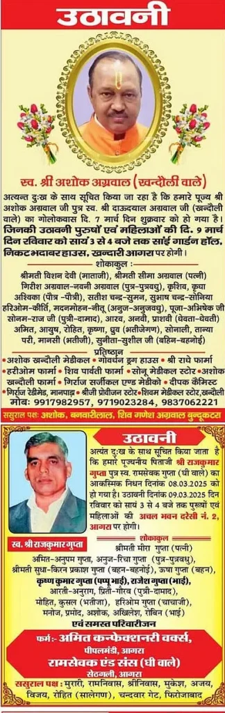 आगरालीक्स …आगरा में आज उठावनी, आगरालीक्स पर उठावनी प्रकाशित कराने के लिए कॉल करें 9997942147