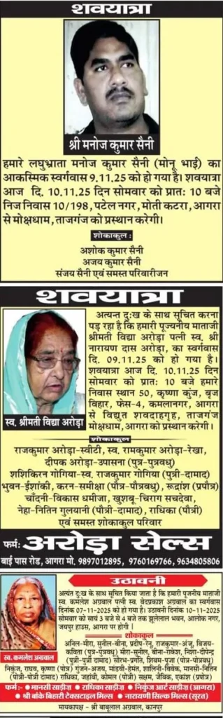 Home आगरा Obituaries of Agra on 10th November 2025