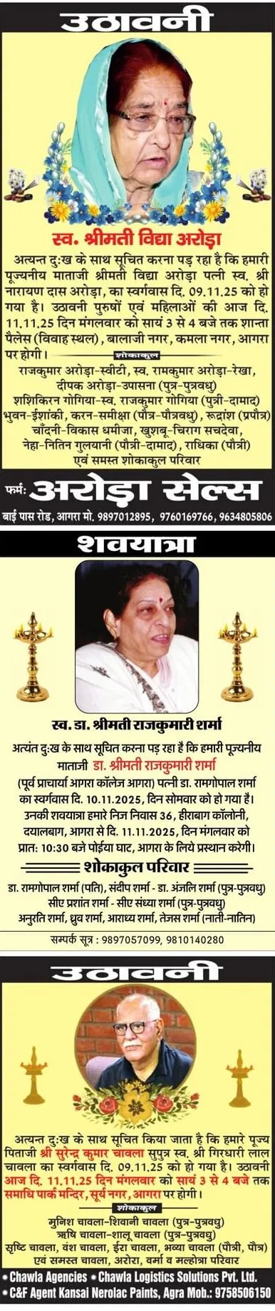 आगरालीक्स:…आगरा में आज उठावनी, आगरालीक्स पर उठावनी प्रकाशित कराने के लिए कॉल करें 999794214