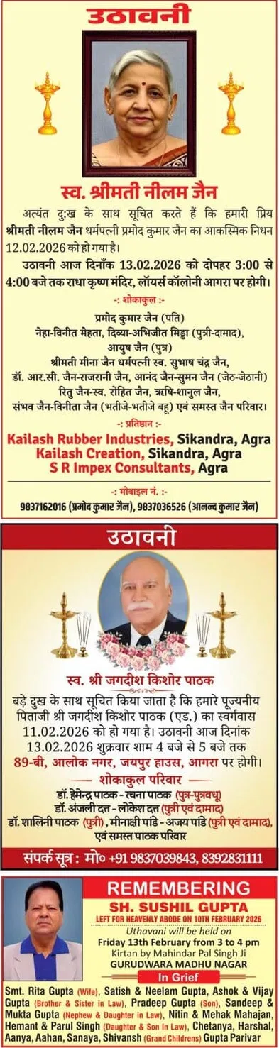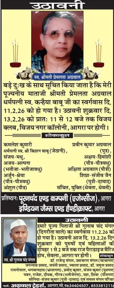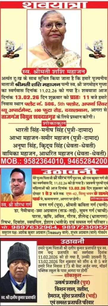 आगरालीक्स:……आगरा में आज उठावनी, शवयात्रा, आगरालीक्स पर उठावनी प्रकाशित कराने के लिए कॉल करें 999794214