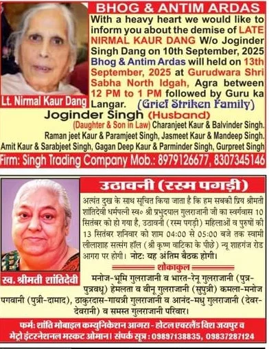 आगरालीक्स:…आगरा में आज उठावनी, शवयात्रा, आगरालीक्स पर उठावनी प्रकाशित कराने के लिए कॉल करें 9997942147
