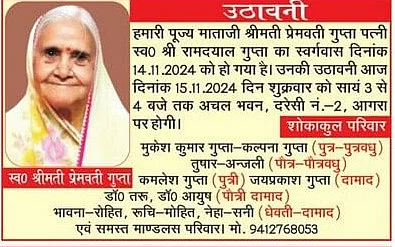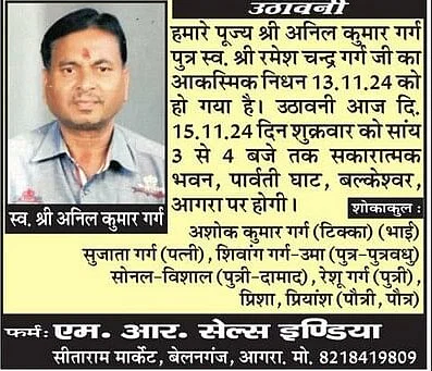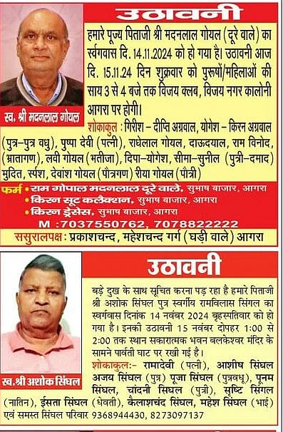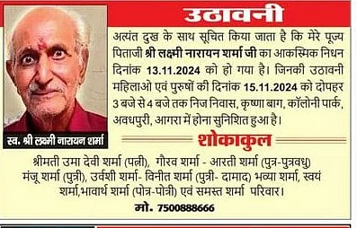 आगरालीक्स.. आगरा में आज 15 नवंबर 2024 को उठावनी और शोकसभा, आगरालीक्स पर उठावनी प्रकाशित कराने के लिए काॅल करें. 9997942147
