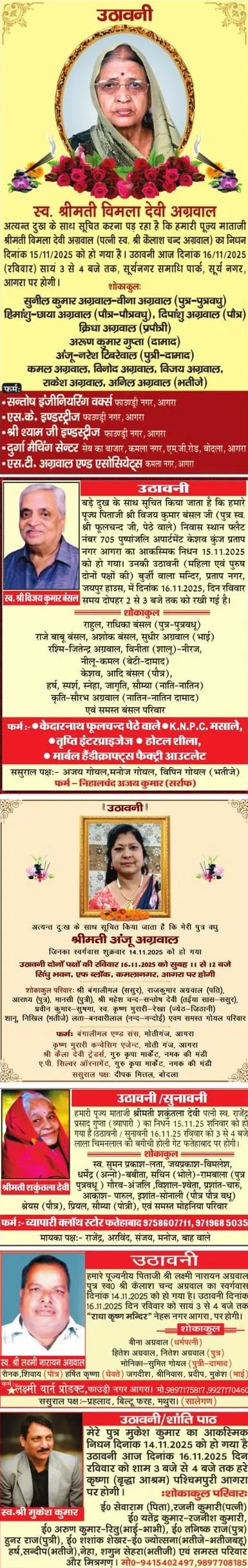आगरालीक्स:…आगरा में आज उठावनी, आगरालीक्स पर उठावनी प्रकाशित कराने के लिए कॉल करें 999794214