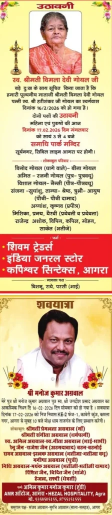 आगरालीक्स:……आगरा में आज उठावनी, शवयात्रा, आगरालीक्स पर उठावनी प्रकाशित कराने के लिए कॉल करें 9997942147
