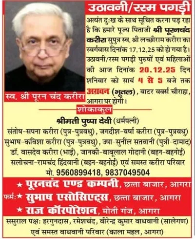 आगरालीक्स:……आगरा में आज उठावनी, आगरालीक्स पर उठावनी प्रकाशित कराने के लिए कॉल करें 9997942147