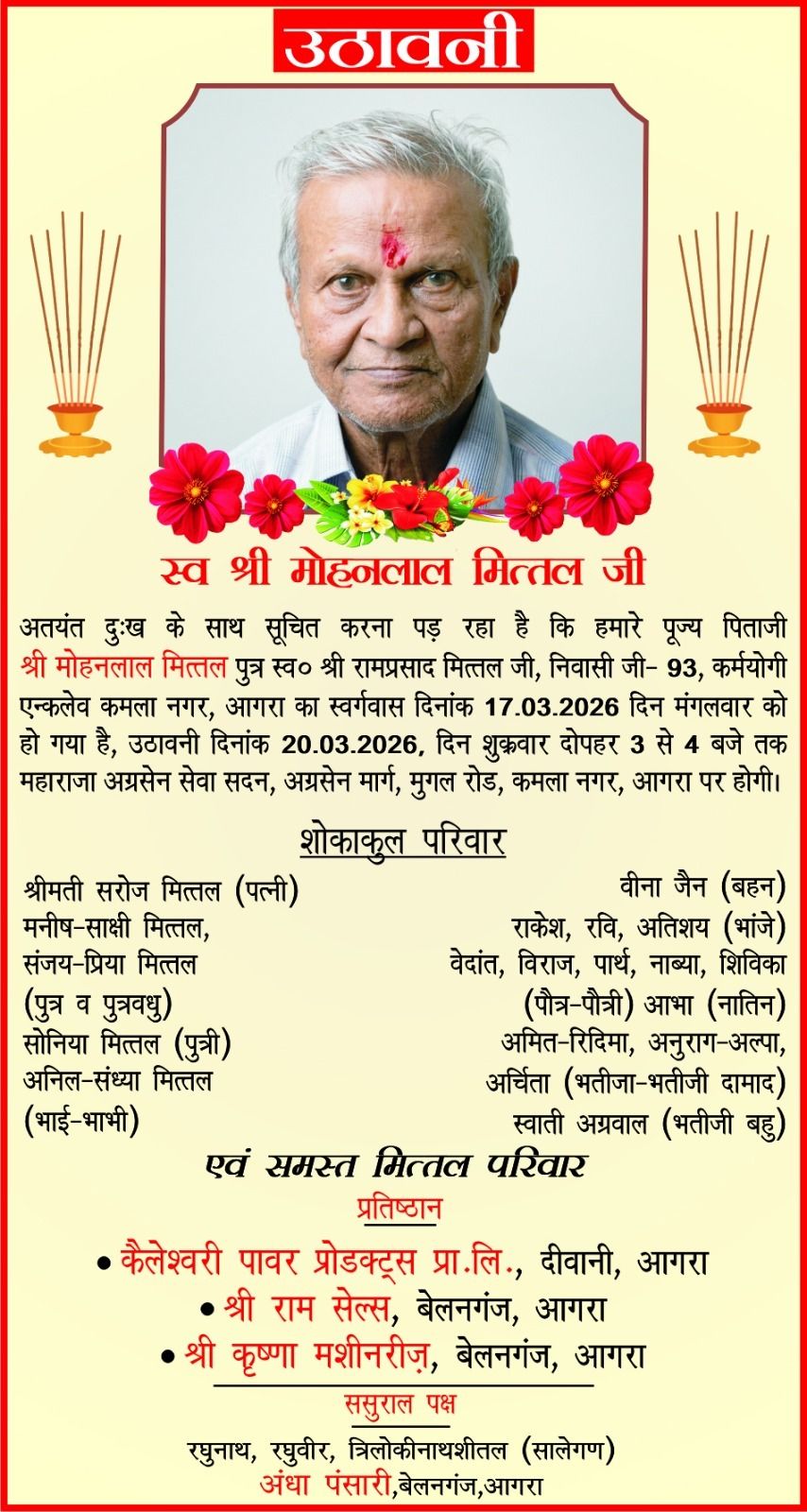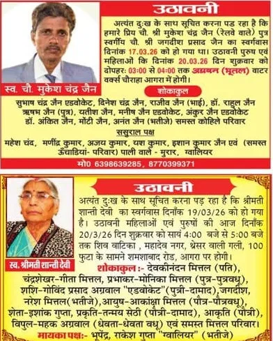 आगरालीक्स:……आगरा में आज उठावनी, शवयात्रा, आगरालीक्स पर उठावनी प्रकाशित कराने के लिए...
