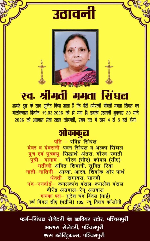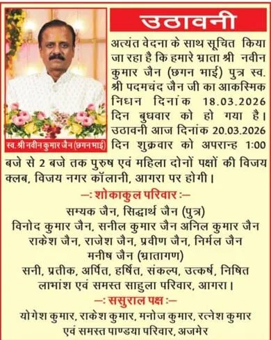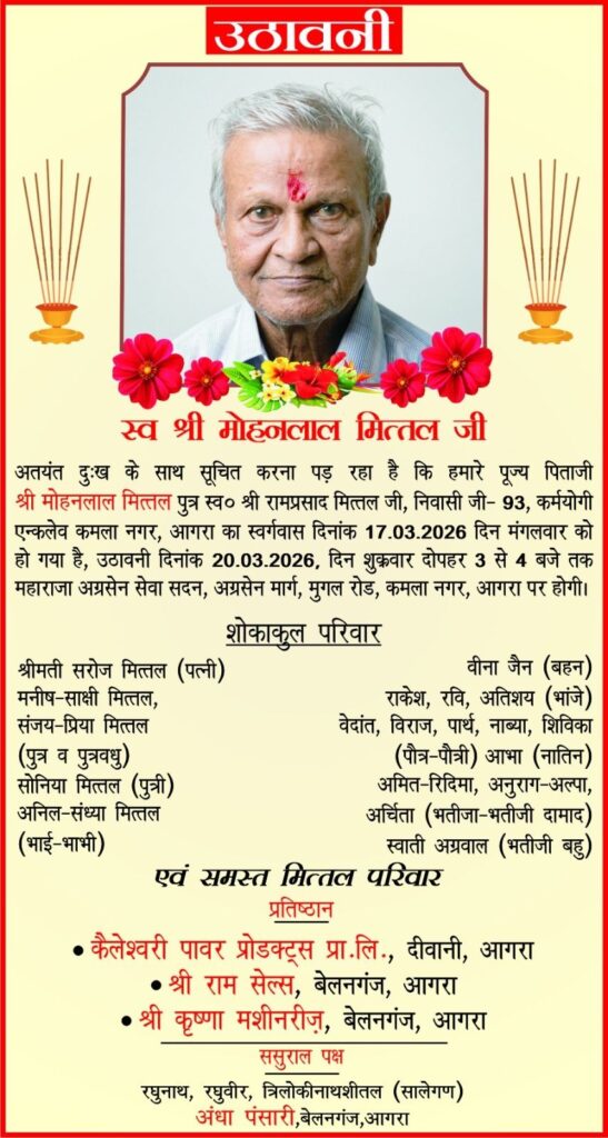 आगरालीक्स:……आगरा में आज उठावनी, शवयात्रा, आगरालीक्स पर उठावनी प्रकाशित कराने के लिए कॉल करें 9997942147