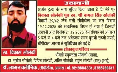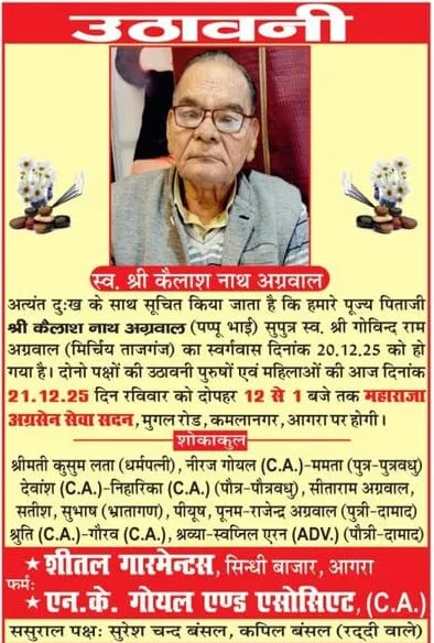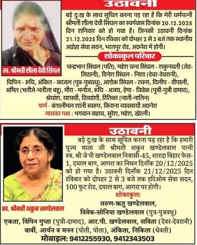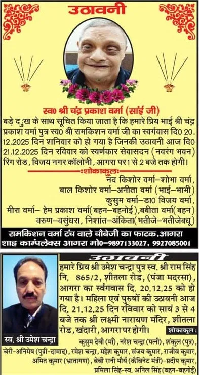 आगरालीक्स:……आगरा में आज उठावनी, आगरालीक्स पर उठावनी प्रकाशित कराने के लिए कॉल करें 9997942147