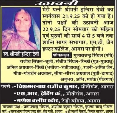 Obituaries of Agra on 22nd September 2025