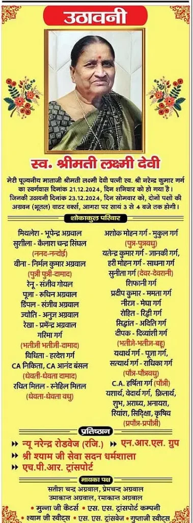 में आज 23 दिसंबर को 2024 को उठावनी और शोकसभा, आगरालीक्स पर उठावनी प्रकाशित कराने के लिए काॅल करें. 9997942147