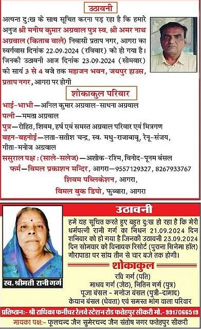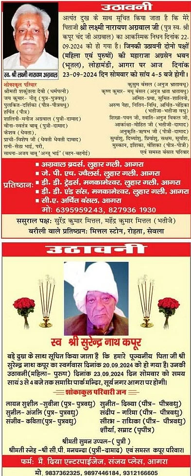 आगरालीक्स.. आगरा में आज 23 सितंबर 2024 को उठावनी और शोकसभा, आगरालीक्स पर उठावनी प्रकाशित कराने के लिए काॅल करें. 9997942147