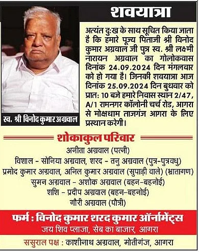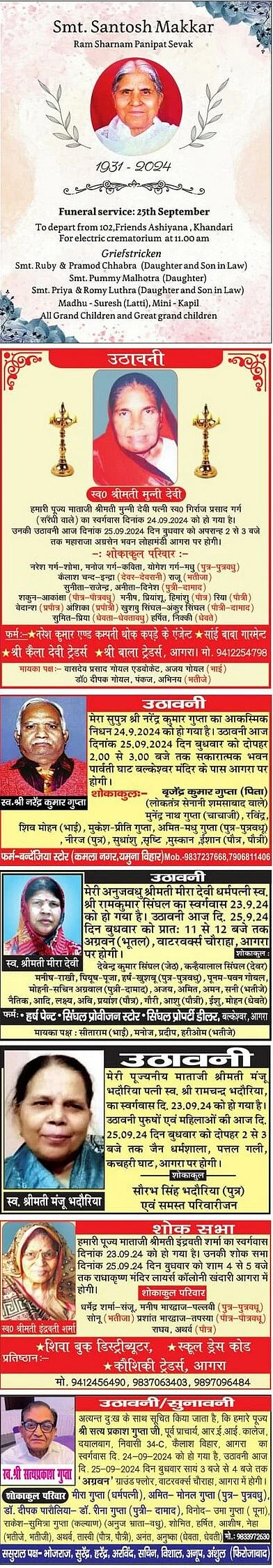 आगरालीक्स.. आगरा में आज 25 सितंबर 2024 को उठावनी और शोकसभा, आगरालीक्स पर उठावनी प्रकाशित कराने के लिए काॅल करें. 9997942147