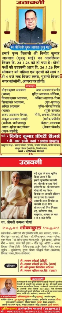 आगरालीक्स:……आगरा में आज उठावनी, शवयात्रा, आगरालीक्स पर उठावनी प्रकाशित कराने के लिए कॉल करें 9997942147