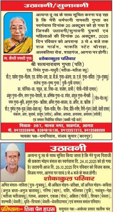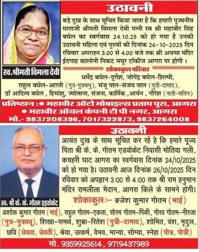 आगरालीक्स:…आगरा में आज उठावनी, आगरालीक्स पर उठावनी प्रकाशित कराने के लिए कॉल करें 999794214