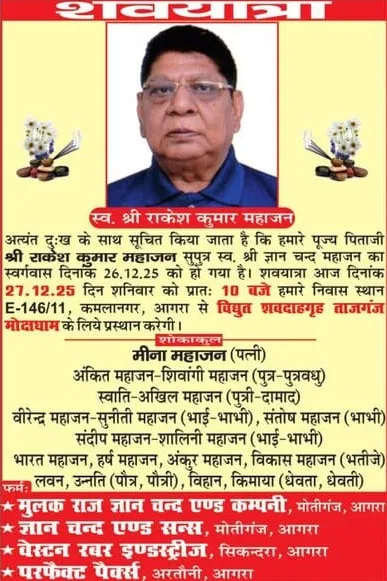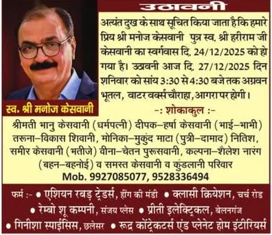 आगरालीक्स:……आगरा में आज उठावनी, आगरालीक्स पर उठावनी प्रकाशित कराने के लिए कॉल करें 9997942147
