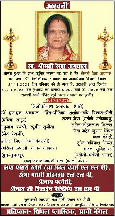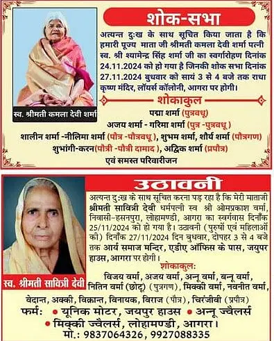 आगरालीक्स.. आगरा में आज 27 नवंबर 2024 को उठावनी और शोकसभा, आगरालीक्स पर उठावनी प्रकाशित कराने के लिए काॅल करें. 9997942147