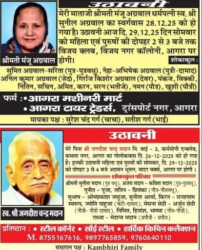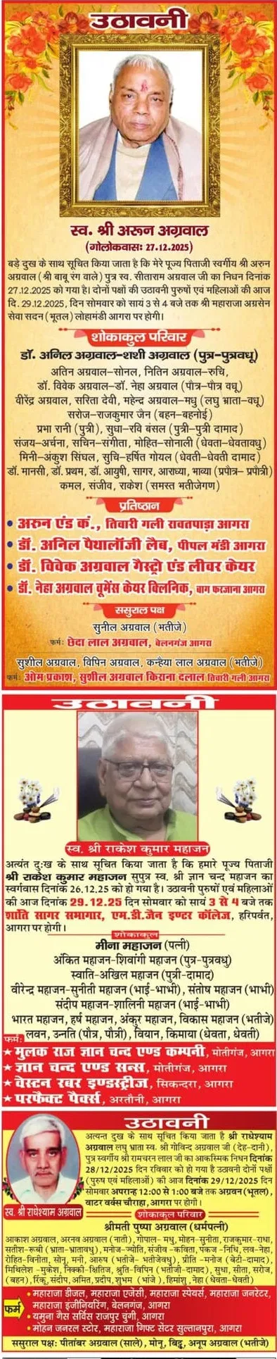 आगरालीक्स:……आगरा में आज उठावनी, आगरालीक्स पर उठावनी प्रकाशित कराने के लिए कॉल करें 9997942147