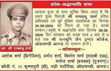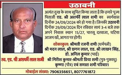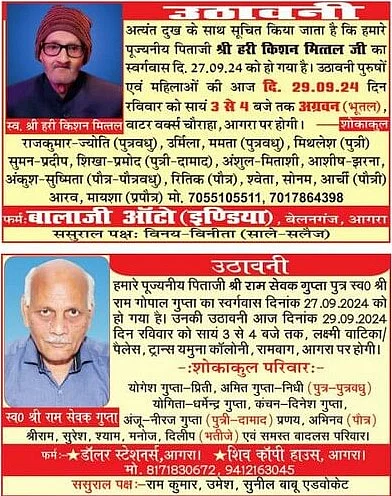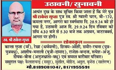 आगरालीक्स.. आगरा में आज 29 सितंबर 2024 को उठावनी और शोकसभा, आगरालीक्स पर उठावनी प्रकाशित कराने के लिए काॅल करें. 9997942147