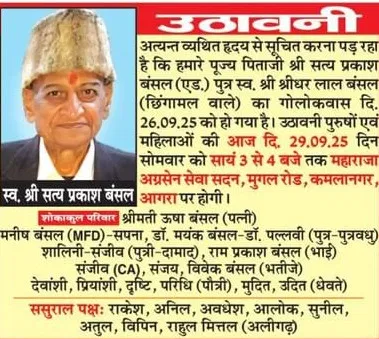 आगरालीक्स:…आगरा में आज उठावनी, शवयात्रा, आगरालीक्स पर उठावनी प्रकाशित कराने के लिए कॉल करें 9997942147