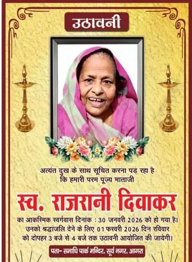 आगरालीक्स:……आगरा में आज उठावनी, शवयात्रा, आगरालीक्स पर उठावनी प्रकाशित कराने के लिए कॉल करें 9997942147